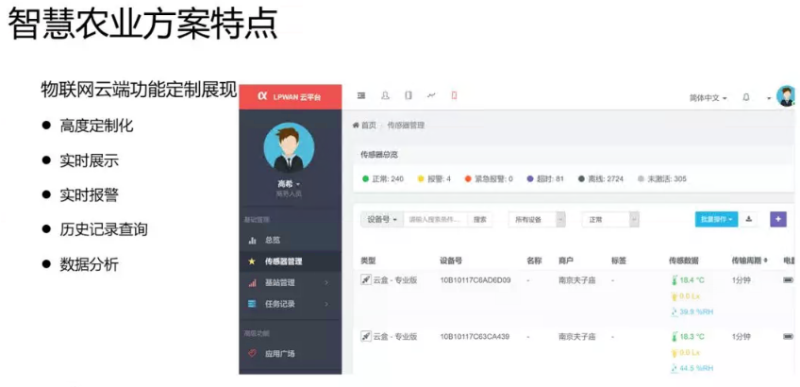 智慧农业解决方案的制定是以物联网技术为基础的,它是集新兴的现代农业移动互联网、物联网、视频监控、RFID、软件工程等技术为一体,依托部署在农业生产现场的各种传感节点(环境温湿度、土壤水分、空气质量二氧化碳、二维码、图像等)和无线通信网络实现农业生产环境的智能感知、智能预警、智能决策、智能分析、专家在线指导,为农业生产提供精准化种植、可视化管理、智能化决策。