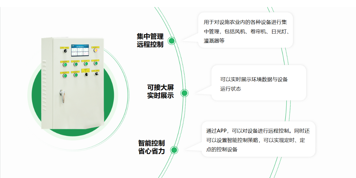 用于生产基地农用电器的控制柜,支持远程手动两种控制模式,控制柜面版按钮或触摸屏的操作方式,触摸显示屏不小于10寸液晶(组态动态人机互动操作界面),支持远程定时设置,支持依据作物模型根据环境指标智能控制电器,380V供电或220V供电,最少支持16路PLC智控设备独立控制,手动、远程控制可选,设备主机为工业级物联网智能控制,支持现有2/3/4G通信自适应模式,可扩展升级LoRa、Zigbee、NB-IoT/5G等制式数据传输,设备支持远程控制和升级存储功能,支持MQTT物联网协议或其他物联网协议,支持断点续传、远程升级,通讯延时不高于3秒。